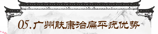 扁平疣又称“扁瘊”和“鱼休子”。是由乳头状瘤病毒感染引起的,具有传染性,病症慢,可持续多年,治疗不当,容易复发...[详情] 扁平型扁平疣 寻常型扁平疣 细胞坏死型扁平疣 棘层增厚型扁平疣 影响形象 扁平疣好发于身体暴露部位,有碍美观,阻碍交际。 易感染 扁平疣抓破后,会感染正常皮肤,产生新的疣体 传染他人 扁平疣具有传染性,易直接或间接传染给他人 影响形象 扁平疣好发于身体暴露部位,有碍美观,阻碍交际。 药物含有激素成分, 长期使用对身体有害。 疼痛出血,刺激疣体增生,造 成病损增大,色素沉着加重! 操作时稍不注意就会损伤其 他正常组织,极易留下疤痕。 铲除表面颗粒,皮下病毒未铲 除,之后又会重新长出来。 当发现身上长出第一个扁平疣的时候,就该及时处理掉,不要拖延,防止抓破后,病毒扩散,长出更多新的疣体。 精准检测 广州肤康皮肤病医院,先进的皮肤超声诊断检测系统,能有效检测出病灶深处、分布等信息,提供有效依据。 光动力治疗 采用UVB紫外线光疗仪、YDQ-500型医用液氮冷枪只对符合病毒特性的耙组织进行杀灭和破坏,恢复正常的形态和功能。 汉方巩固 采用汉方特制中药制剂,修复肌肤受损细胞,对引起扁平疣的高危HPV病毒起吞噬作用,强效杀灭真菌,防止复发。